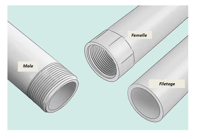 Dans les installations domestiques, le diamètre d’un tuyau PER peut varier de 16 à 63 mm. Les filetages, ce sont ces rainures visibles à l’extrémité des tubes, qui permettent leur raccordement. Si le filetage est à l’extérieur du tube, il est dit « mâle » ; à l’intérieur, on parle de filetage « femelle ».