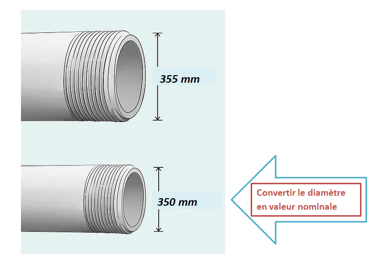 Une fois la mesure prise, il faut la convertir en taille nominale si elle est inférieure à 360 mm. Pour les tuyaux plus larges, pas besoin de conversion : le diamètre réel équivaut à la taille nominale.